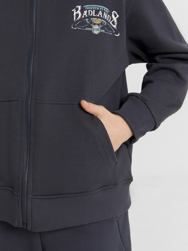 Жакет для мальчиков прямого силуэта с капюшоном. Капюшон на подкладке из основного полотна. Шов втачивания капюшона закрыт х/б тесьмой. Рукава втачные, линия плеча спущена. Притачные манжеты по низу рукавов и притачной пояс из рибаны. По переду застежка молния, карман кенгуру.