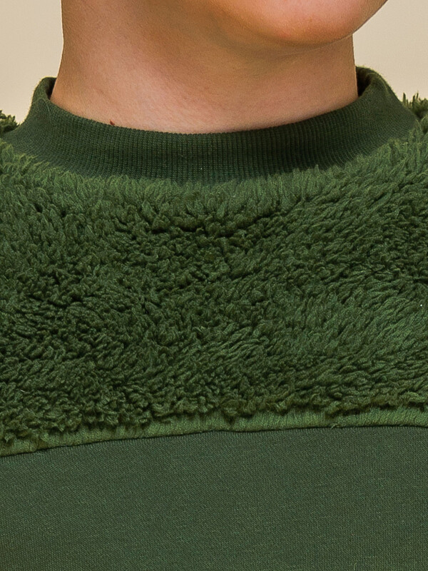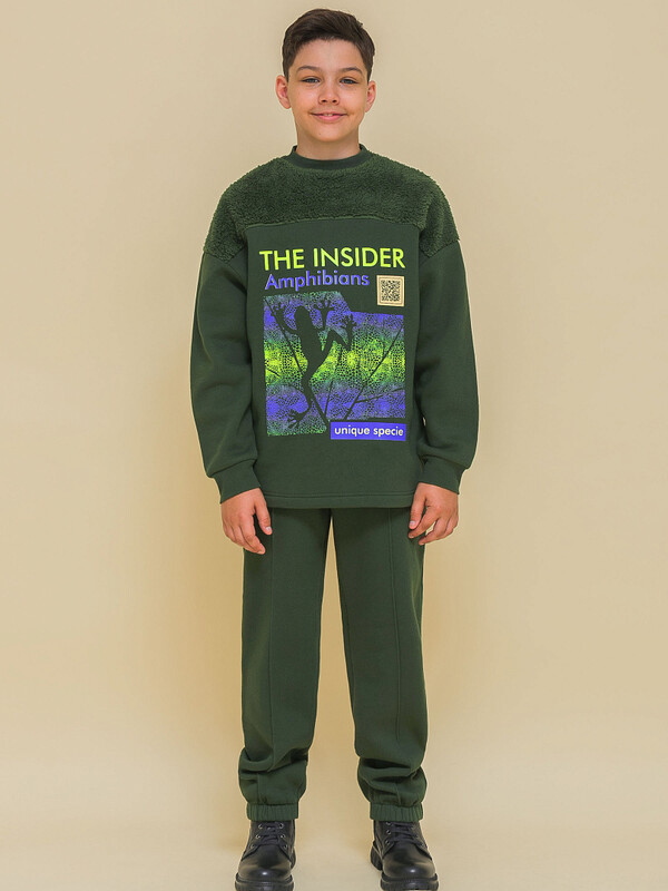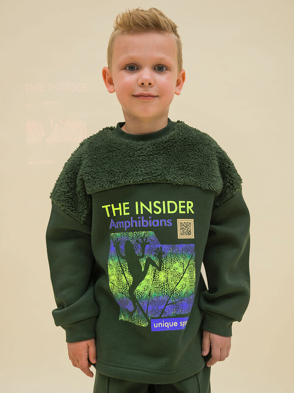 Свитшот детский для мальчика. Свободный джепер со спущенным плечом подарит ребёнку комфорт и не будет стеснять его движений. Объёмная толстовка выполнена в сочетании двух материалов: футера с начёсом и мягкого бербер-флиса (фактура «барашка») на кокетке переда и спинки. Комбинация материалов разной фактуры — актуальный модный тренд. Манжеты и отделка горловины выполнены из эластичной рибаны. Она не растягивается, прекрасно сохраняет форму, при этом ребёнку удобно надевать и снимать свитшот. За толстовкой просто ухаживать. Свитшот с принтом по переду выполнен из ткани с высоким содержанием качественного хлопка — он мягкий, тёплый и хорошо пропускает воздух. Полиэстер помогает сохранить цвет и первозданный внешний вид надолго. Оригинальный принт в виде лягушки с надписями «инсайдер амфибия» и «уникальный вид» дополнен QR-кодом, при сканировании которого можно прочитать уникальные научные факты о лягушках. Принт эластичный и прочный, не боится частых стирок. Свитшот с начёсом выполнен в универсальном цвете хаки. В линейке представлены следующие размеры: 1 (86); 2 (92); 3 (98); 4 (104); 5 (110); 6 (116); 7 (122); 8 (128); 9 (134); 10 (140); 11 (146). Оверсайз-свитшот подходит как для маленьких мальчиков, так и для подростков. Его можно носить круглый год: осенью и весной (демисезон), зимой, в прохладную погоду летом. Толстовка идеальна для детского сада, прогулок, активного отдыха, дома. Детский свитшот — отличный подарок сыну, брату, внуку или племяннику на Новый год и любой другой праздник.