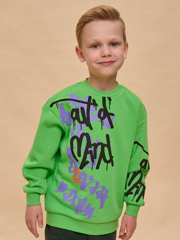 Свитшот детский для мальчика. Свободная толстовка со спущенным плечом и углубленной проймой подарит ребёнку комфорт и не будет стеснять его движений. Объёмный джемпер средней длины — актуальный модный тренд. Манжеты, отделка горловины и низа изделия выполнены из эластичной рибаны (ткани в рубчик). Она не растягивается, отлично сохраняет форму, при этом ребёнку удобно надевать и снимать свитшот. Модель неприхотлива в уходе. Свитшот с принтом по переду и на левом рукаве выполнен из футера с начёсом. Принты мягкие и эластичные, великолепно переносят частые стирки. Надписи переводятся: «не в себе», «смешанные чувства». В составе ткани преобладает высококачественый хлопок — толстовка приятна на ощупь и прекрасно пропускает воздух. Полиэстер помогает сохранить цвет и первозданный внешний вид надолго. Детский свитшот выполнен в модном желтом цвете. Размерная линейка: 1 (86); 2 (92); 3 (98); 4 (104); 5 (110); 6 (116); 7 (122); 8 (128); 9 (134); 10 (140); 11 (146). Оверсайз-свитшот подходит как для маленьких мальчиков, так и для подростков. Джемпер идеален для детского сада, прогулок, активного отдыха, дома. Свитшот с начесом можно носить круглый год: весной и осенью (демисезон), зимой, в прохладную погоду летом. Это отличный подарок сыну, внуку, брату или племяннику на любой праздник.