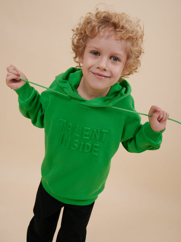 Изделие выполнено в однотонном цвете на выбор: бежевый, черный, зеленый. Худи для мальчика подростка оверсайз спереди декорировано выпуклым пресс-принтом: "Talent inside" - перевод "Талант внутри". Толстовка оверсайз рассчитана на возраст садика и школы. Понравится как малышам, так и школьникам и подросткам. Размерная линейка: 1 (86); 2 (92); 3 (98); 4 (104); 5 (110); 6 (116); 7 (122); 8 (128); 9 (134); 10 (140); 11 (146).