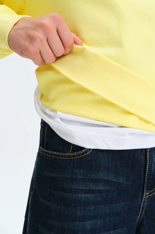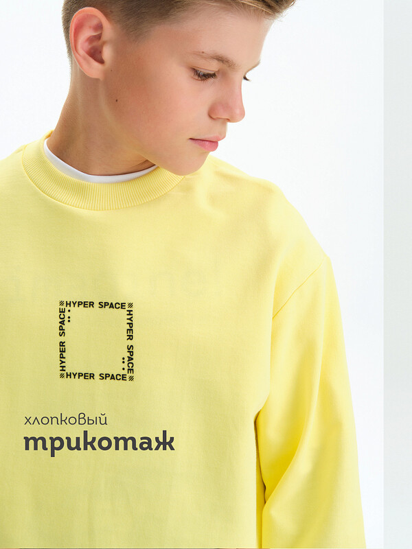 Свитшот без начеса из материала футер-петля. Манжеты и низ изделия из рибаны. По переду толстовки выпуклый силиконовй текстовый принт. Перевод надписи: Гипер пространство. Рукав также украшен выпуклым силиконовым принтом с надписью. Перевод надписи: Создано для радости и вдохновения/
