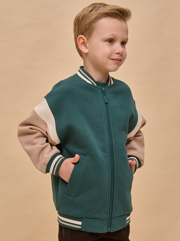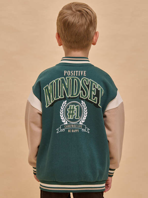 Бомбер детский для мальчиков. Стильная куртка в актуальном университетском стиле из тёплого футера с начёсом заменит ветровку в прохладную погоду. Модель свободного силуэта со спущенным плечом — ребёнку комфортно и свободно. Жакет на мальчика застёгивается на центральную молнию — актуально и практично. Горловина, низ изделия и рукавов отделаны широкой декоративной рибаной (ткань в рубчик), она эластичная и прекрасно тянется, долгое время не теряя формы. Модель выполнена из ткани с высоким содержанием хлопка — она дышащая, мягкая и комфортная. Благодаря полиэстеру бомбер сохраняет превосходный внешний вид надолго. Куртка детская дополнена удобными прорезными карманами по бокам. Бомбер для мальчика украшен принтом в модном университетском стиле по спинке. Ндписи переводятся: «позитивное мышление», «беззаботная жизнь», «будь счастливым». Жакет отлично сочетается с различными брюками и джинсами. Уютная и стильная куртка для мальчика неприхотлива в уходе. Помните о правильном уходе за изделием: рекомендуется стирать при температуре не выше 30 °C, без предварительного замачивания, с изнанки. Это поможет сохранить качество и цвет бомбера на длительное время.