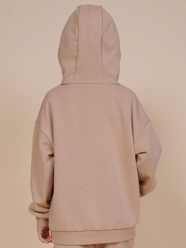 Детское худи для мальчика из материала футер-петля. Изделие свободного кроя оверсайз со спущенным плечом, углубленной проймой. Рукава и низ на манжете из риба. Капюшон на запахе, с люверсами и шнурками для регулировки.
