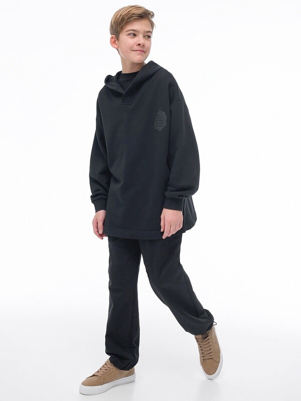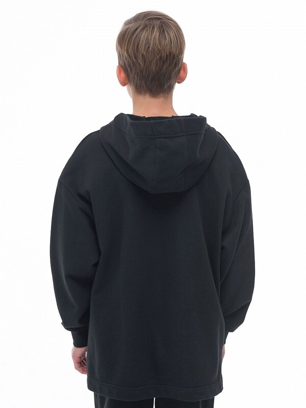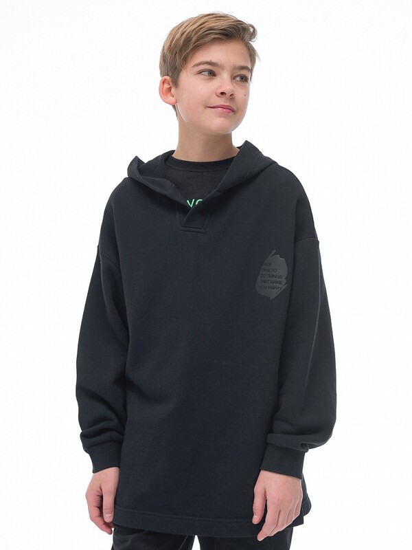 Худи оверсайз из футера для мальчика. Ткань мягкая, дышащая, с большим содержанием хлопка в составе, приятная на ощупь. Прямые широкие рукава, спущенное плечо и свободный крой – настоящий трендовый оверсайз. Рукава на манжете из рибаны – удобная фиксация. Низ изделия с боковыми разрезами и широкой подгибкой из основной ткани – модный тренд на увеличенные отделочные детали кроя. Теплый и удобный капюшон без утяжки для свободы движения. Сбоку матовый силиконовый и тактильно приятный принт с позитивной надписью. Худи составляет гармоничный дуэт с джоггерами. Подходит на каждый день, для учебы и занятия спортом.