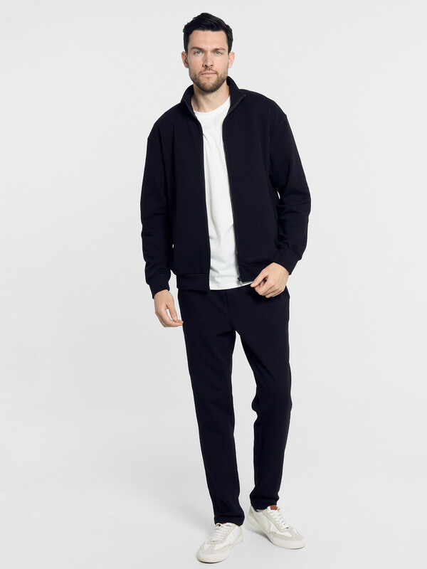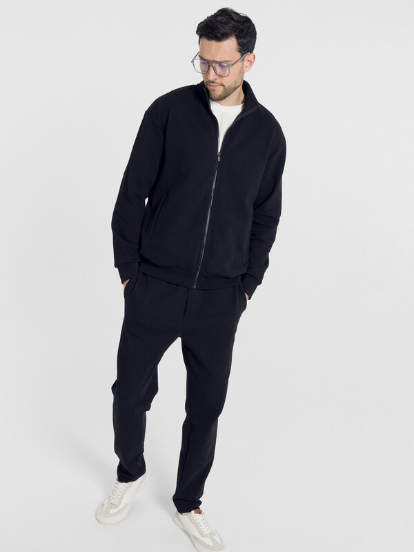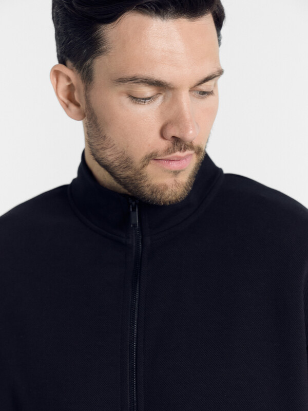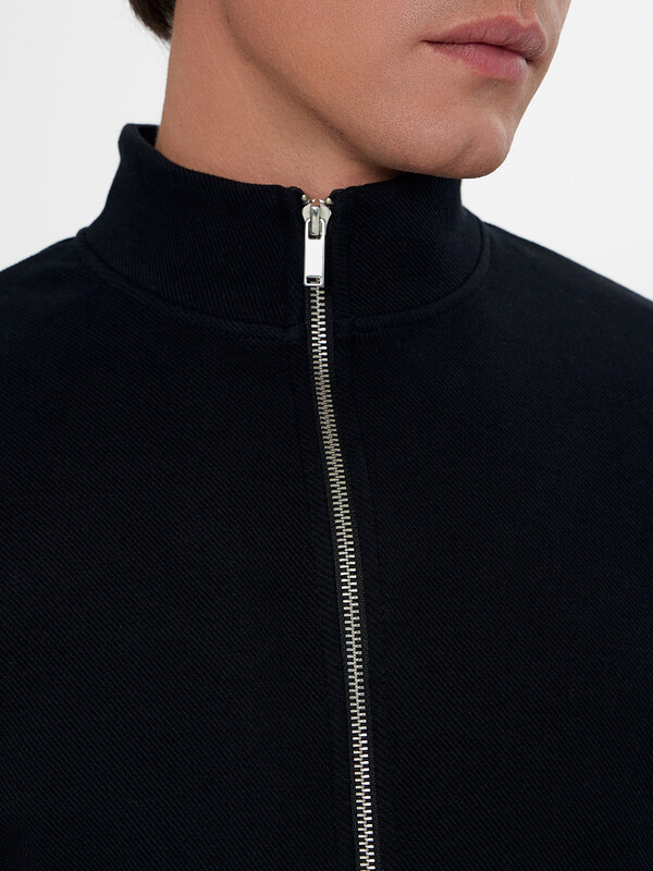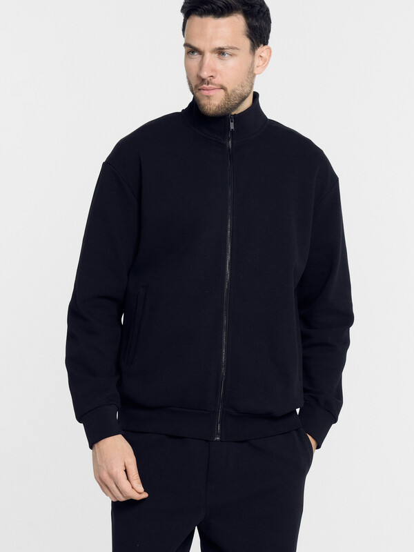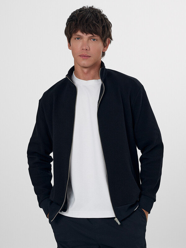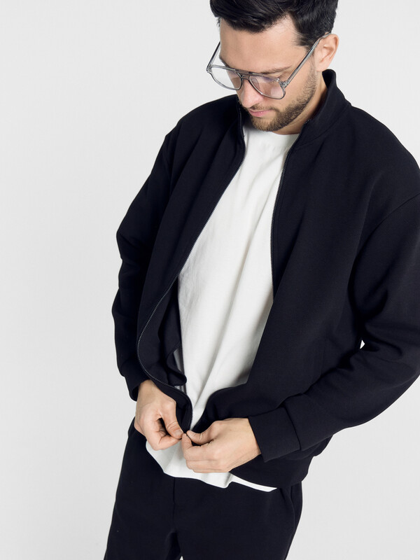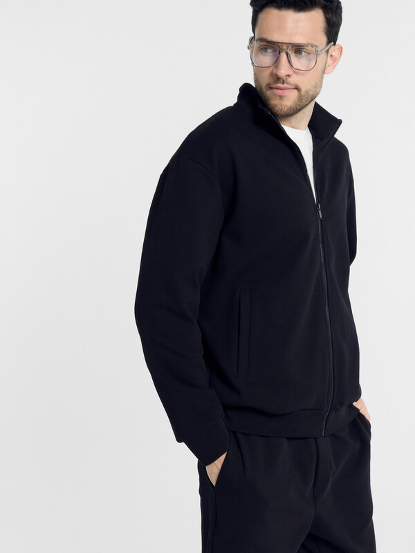 Текстильный жакет прямого силуэта из интерлока. Горловина округлой формы с воротником стойкой. По центру жакет застегивается на молнию. Есть боковые прорезные карманы. Рукава длинные, с манжетами из рибаны, как и отрезной пояс, проходящий по нижнему краю. Стильно и удобно!