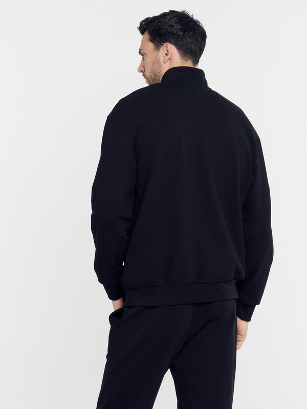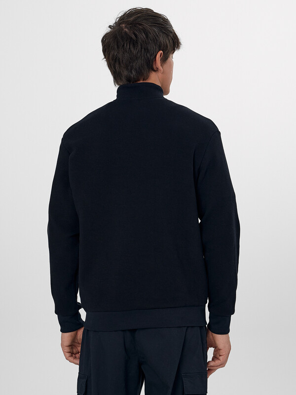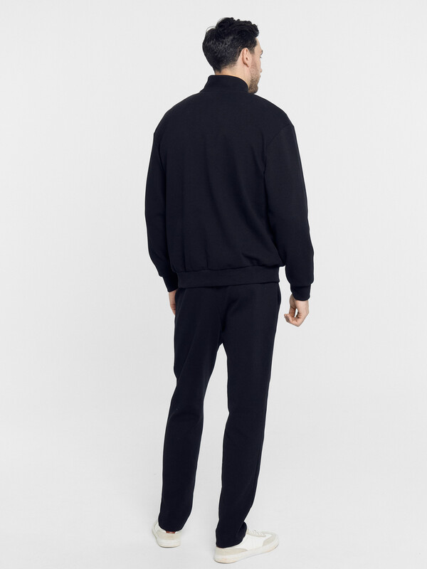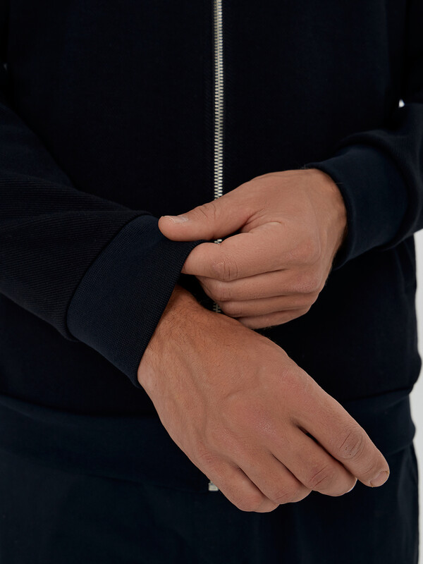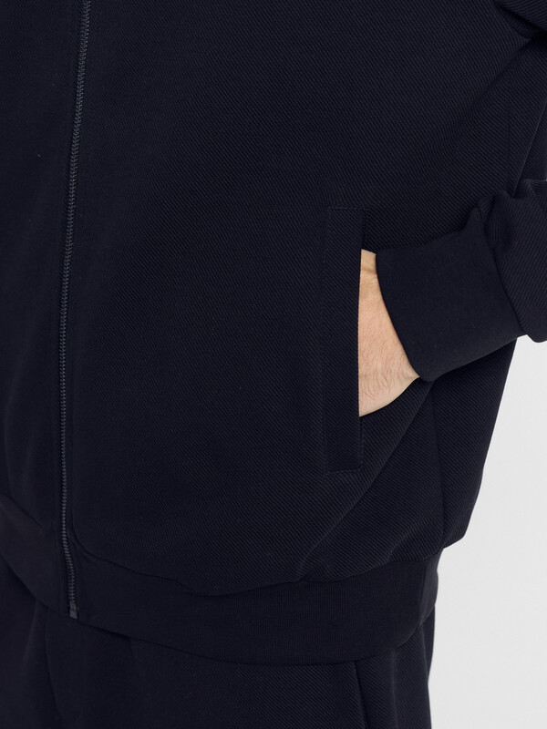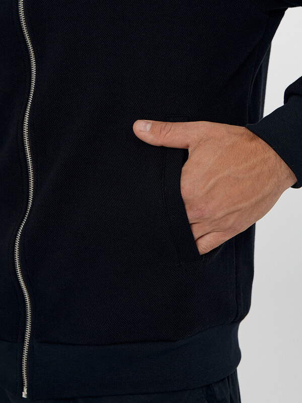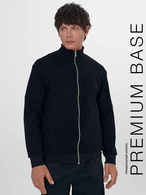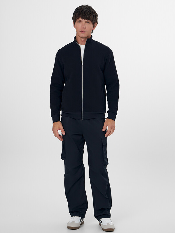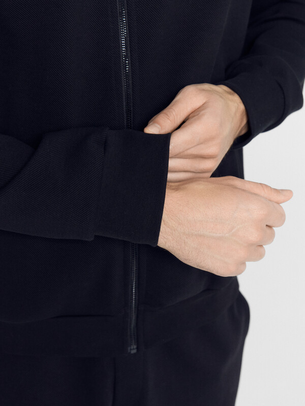 Текстильный жакет прямого силуэта из интерлока. Горловина округлой формы с воротником стойкой. По центру жакет застегивается на молнию. Есть боковые прорезные карманы. Рукава длинные, с манжетами из рибаны, как и отрезной пояс, проходящий по нижнему краю. Стильно и удобно!