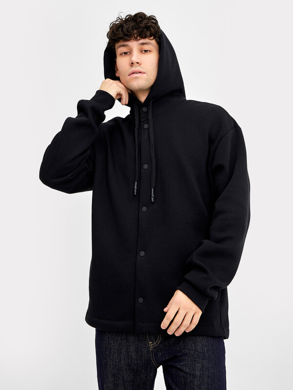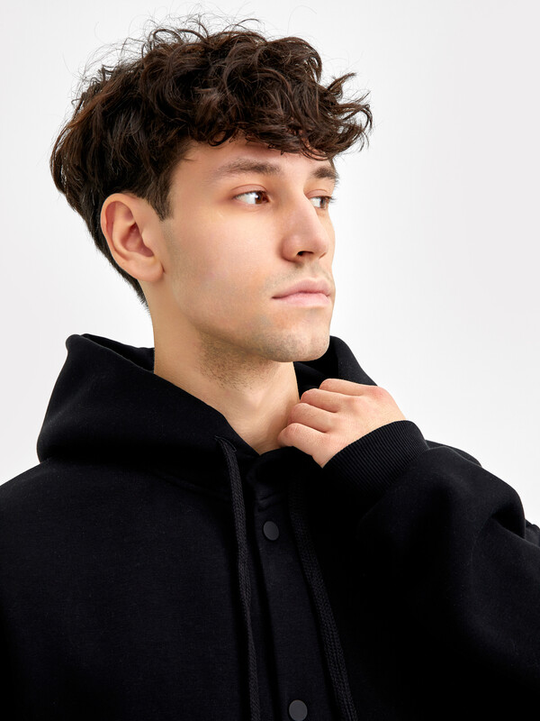 По переду обработана центральная застежка на кнопки, верхняя кнопка распологается на капюшоне.
