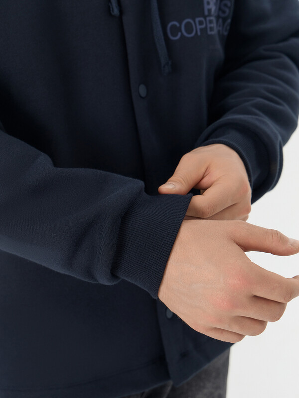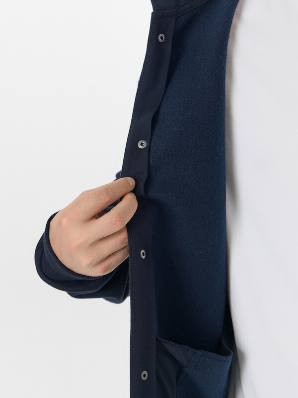 По переду обработана центральная застежка на кнопки, верхняя кнопка распологается на капюшоне.