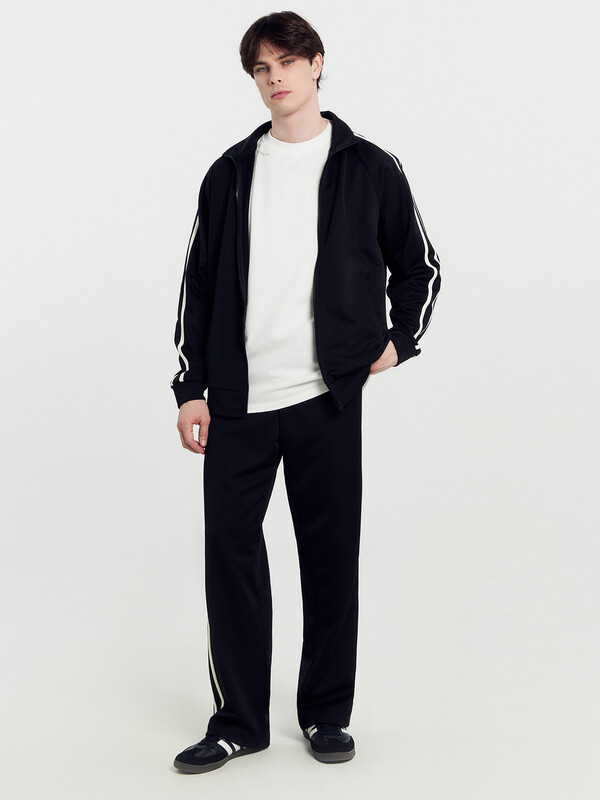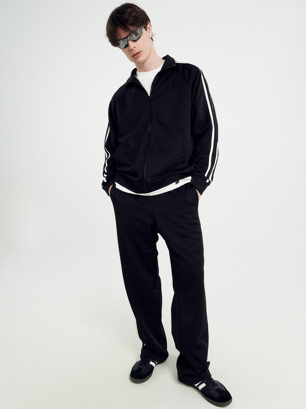Рукав реглан, с отрезными манжетами. По центру рукава настрочены лампасы из кулирки.