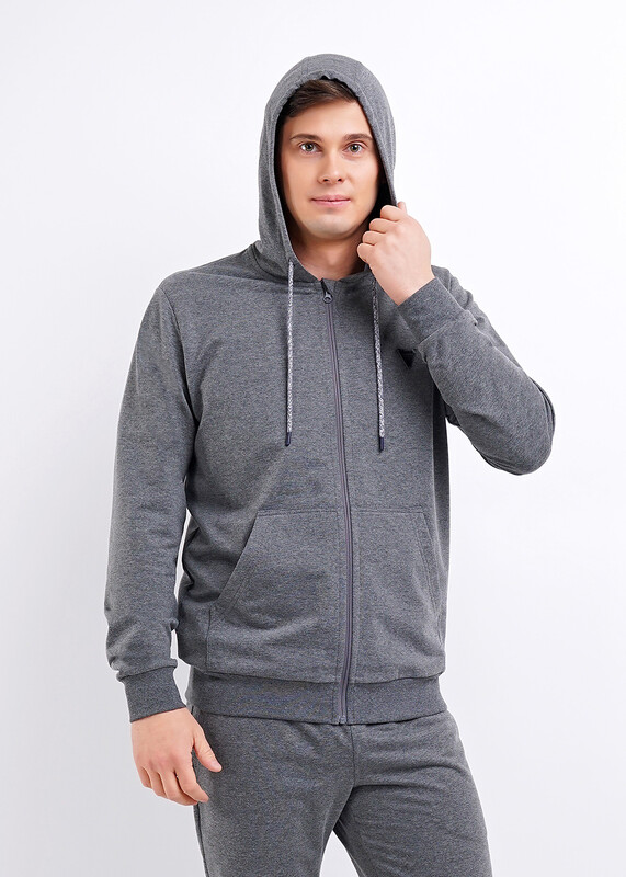 Модная куртка с капюшоном на молнии из плотного трикотажного полотна будет незаменимой вещью в гардеробе любого мужчины благодаря функциональным карманам "кенгуру" и стильной отделке изделия.