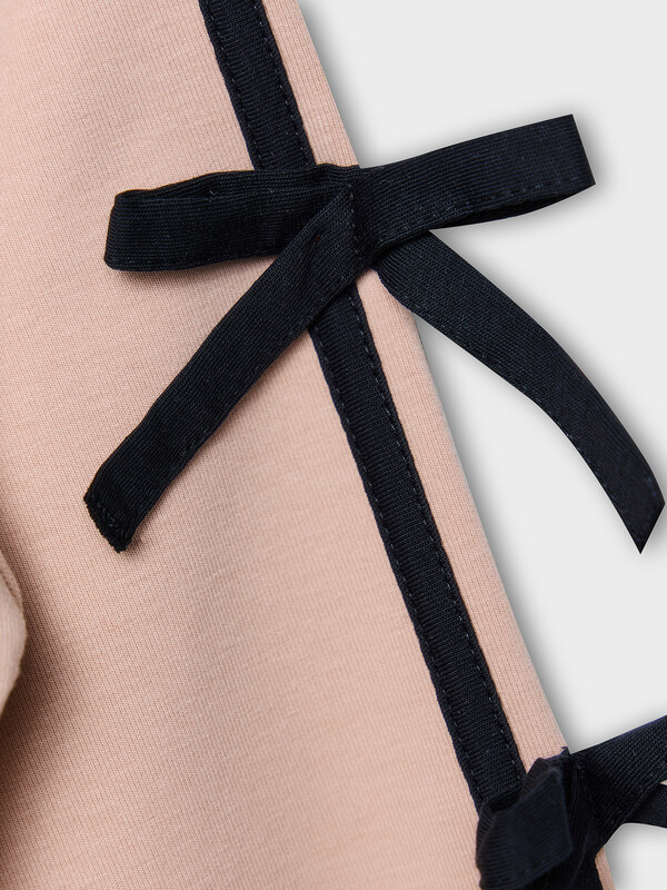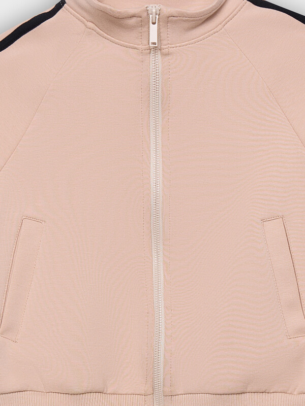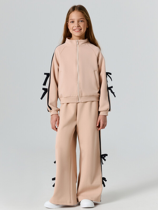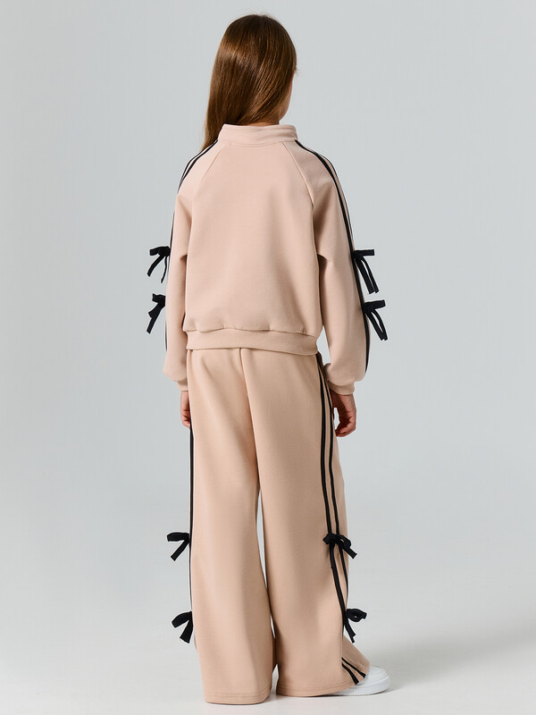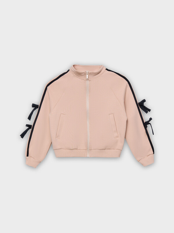 Толстовка свободного силуэта. В горловину втачен воротник-стойка. Рукава- реглан. По низу рукава манжеты из рибаны На рукавах настрочены лампасы и бантики из кулирного полотна. По переду застежка на молнию. На деталях переда прорезные карманы. По низу изделия отрезной пояс из рибаны.