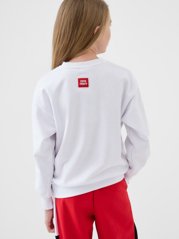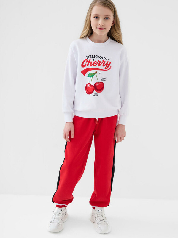 Свитшот оверсайз для девочки подростка. Выполнен из хлопкового футера без начеса. На передней части — выразительный принт с вишнями. Горловина, манжеты и низ изделия оформлены эластичными резинками.