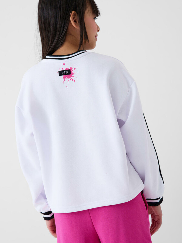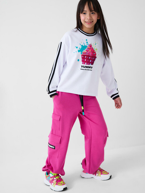 Свитшот оверсайз для девочки подростка. Выполнен из хлопкового футера без начеса. На передней части — выразительный принт с капкейком. Низ изделия и рукава оформлены эластичными резинками. Модель укороченная, длиной до бедер.