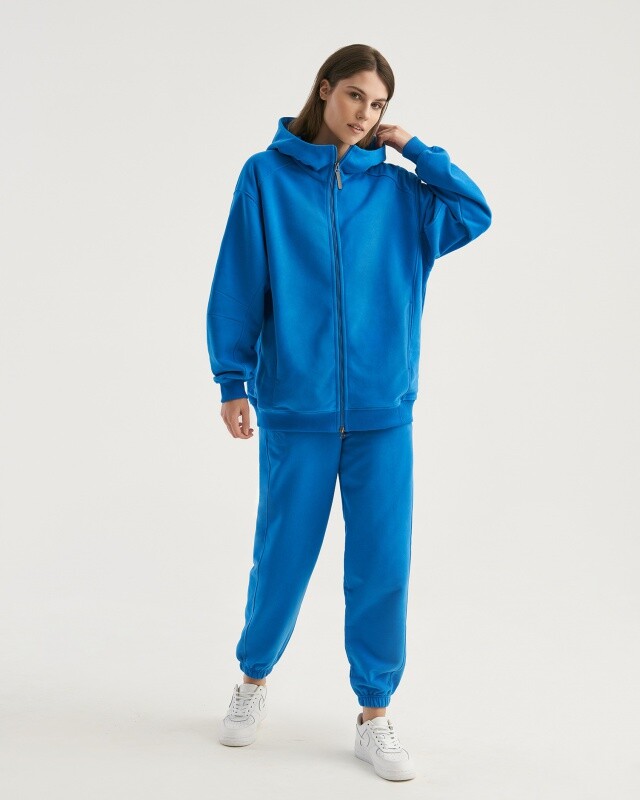 Толстовка на молнии, с отрезными кокетками. Двойной капюшон. Рукав втачной с вытачками по переднему шву. В рельефах переда карманы в шве. Манжеты и пояс из кашкорсе.