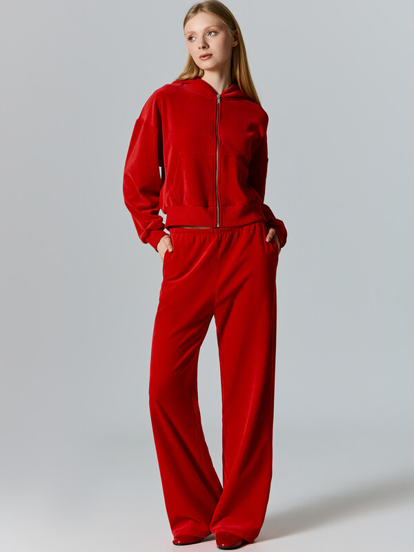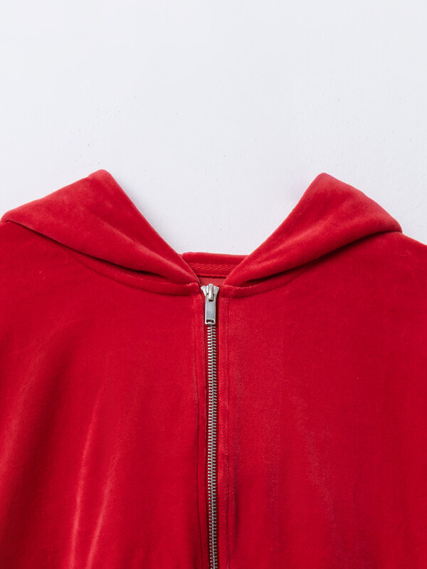 Толстовка женская свободного силуэта. Перед и спинка цельнокроеные. Рукава длинные, втачные. По переду центральная застежка на металлическую молнию и накладные карманы. Горловина обработана капюшоном. По низу рукавов манжеты, пояс и манжеты из рибаны.