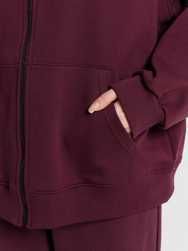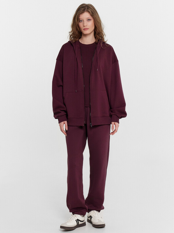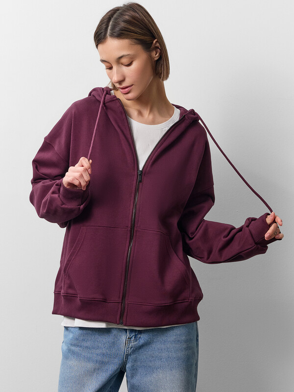 капюшона по горловине спинки закрыт тесьмой (хб 10мм). Рукав втачной, длинный с отрезными манжетами из рибаны. Линия плеча спущена. По переду накладной карман кенгуру. Центральная застежка на тесьму-молнию. По низу толстовки отрезной пояс из рибаны.