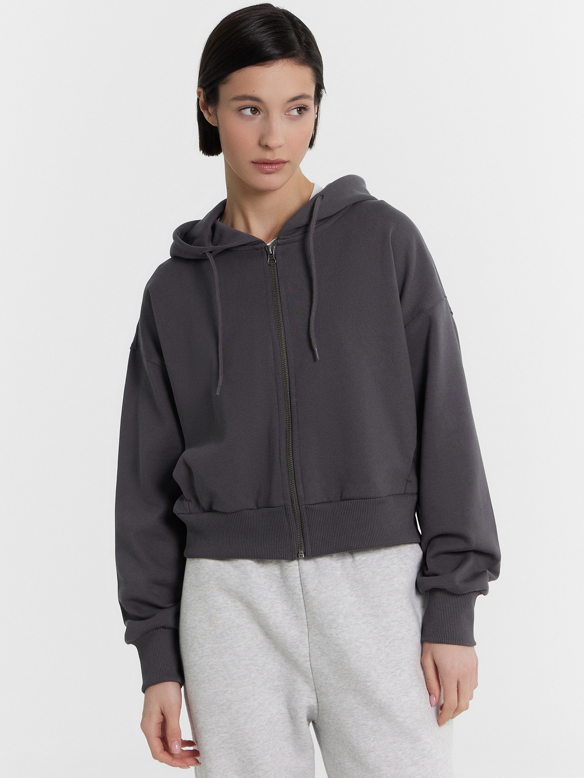 Укороченная женская толстовка – стильный и удобный выбор для вашего гардероба. Капюшон на кулиске обеспечивает защиту от ветра, а центральная застежка на молнию позволяет легко надевать и снимать изделие. Длинные рукава с эластичными манжетами из рибаны удерживают тепло и обеспечивают комфорт, в то время как спущенная линия плеча придает стильный и расслабленный вид. Боковые карманы добавляют функциональности, позволяя хранить мелкие вещи. Выполненная из футера без подчеса, толстовка отличается мягкостью и долговечностью, обеспечивая комфорт при носке. Она идеально подойдет для создания повседневных и спортивных образов, легко сочетаясь с различными элементами гардероба.