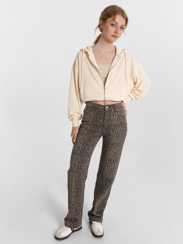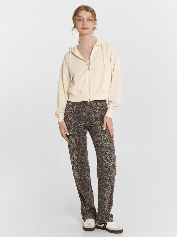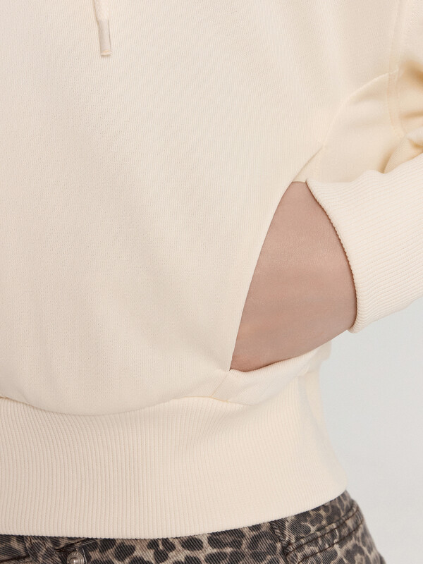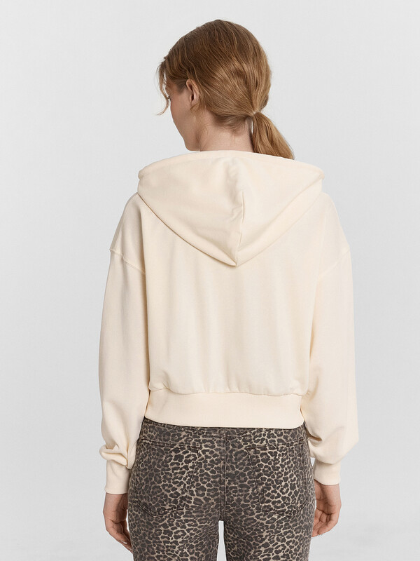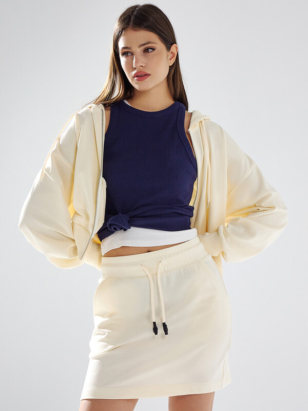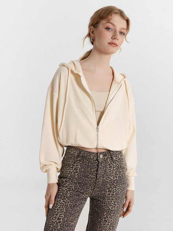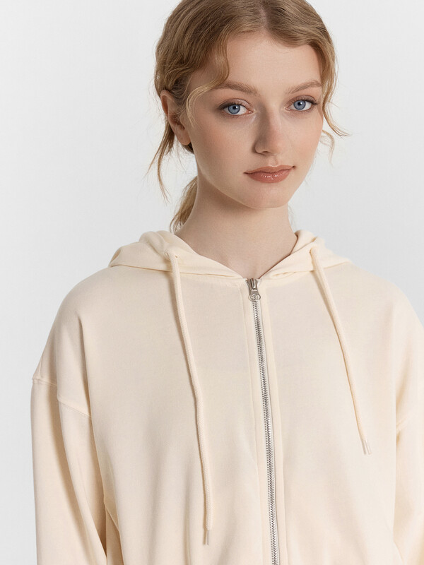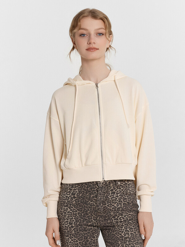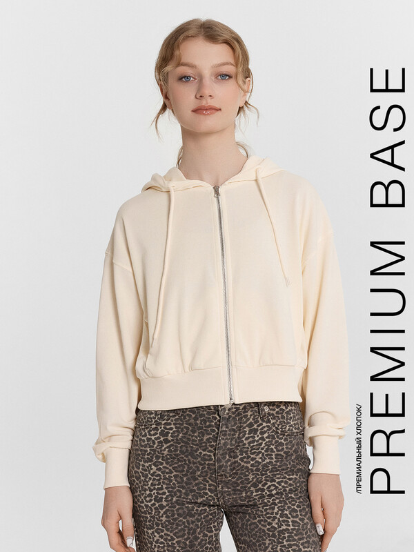 Толстовка свободного силуэта, укороченная. Горловина круглой формы с капюшоном. Капюшон цельнокроеный с подкладкой. На внешней стороне капюшона пробиты петли и вставлен шнур 8мм с эглетами (8EКXWCp-1). Шов втачивания капюшона закрыт бейкой из кулирки. Центральная застежка на тесьму-молнию. Рукава втачные длинные с отрезными манжетами из рибаны. Плечо спущено. На деталях переда вертикальные рельефы. В рельефах обработаны карманы. Подкладка кулирка. По низу отрезной пояс из рибаны.