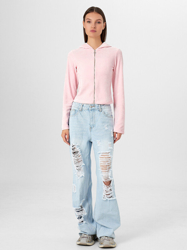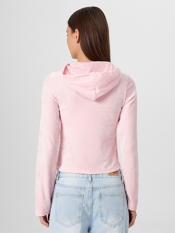 Нижние срезы толстовки и рукавов обработаны швом вподгибку.