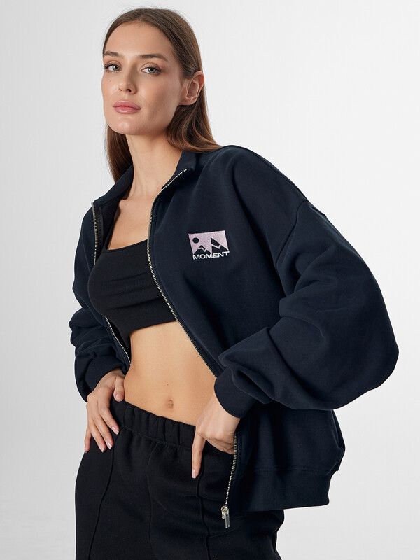 Женская толстовка на молнии с надписью «Момент» — идеальный спутник для ваших самых ярких дней. Свободный оверсайз крой и воротник-стойка, облегающий шею, надежно защищает от ветра и прохлады, даря ощущение комфорта. Длинные рукава с эластичными манжетами и поясом из рибаны мягко облегают фигуру, подчеркивая стильный силуэт.