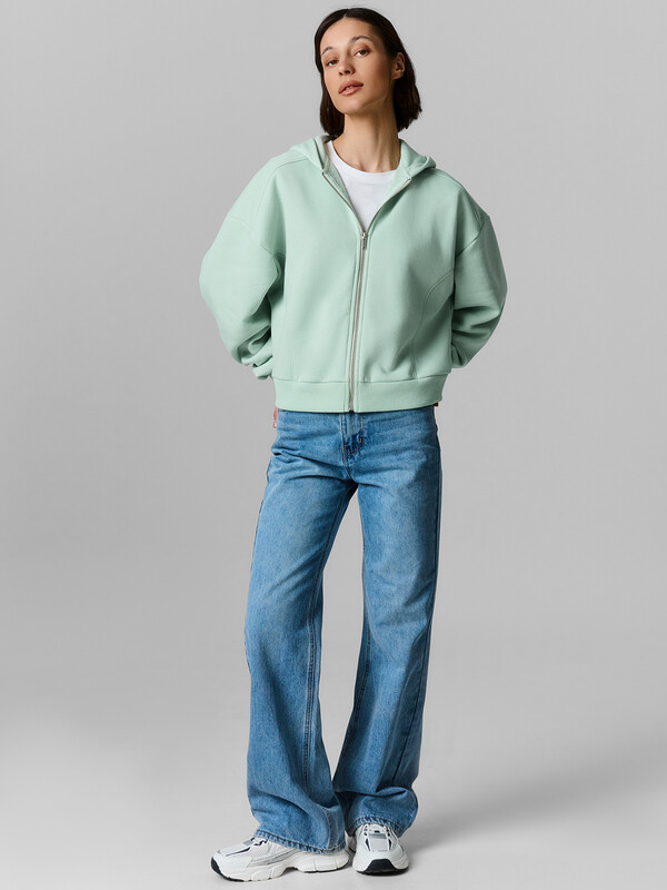Толстовка свободного силуэта из трикотажного полотна футер. Горловина круглая, обработана капюшоном.