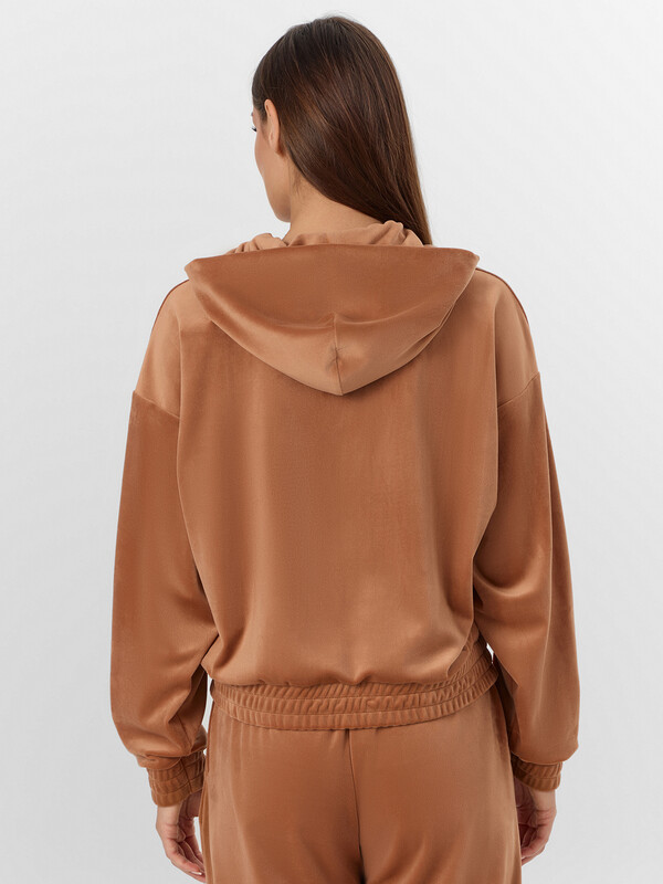 Манжеты на рукавах и пояс по низу, дополненные декоративными строчками, обеспечивают аккуратную посадку. Внутренние швы горловины обработаны мягкой хлопковой тесьмой для приятных тактильных ощущений. Велюровый материал с добавлением эластана мягко тянется и дарит нежность при каждом движении. Эта толстовка станет любимым предметом гардероба для спокойных вечеров и утреннего отдыха.