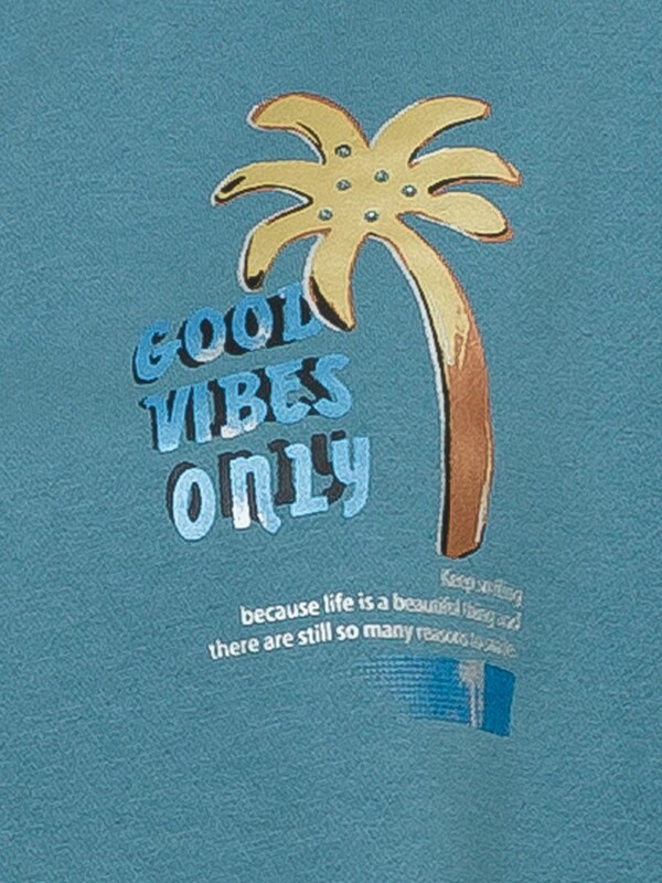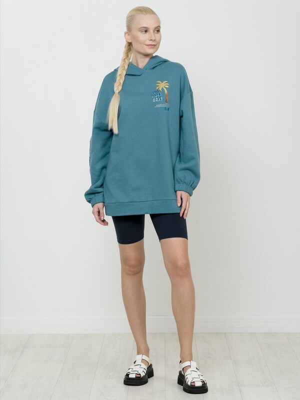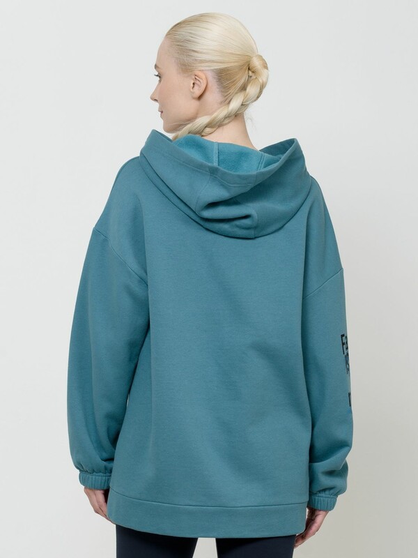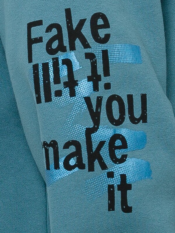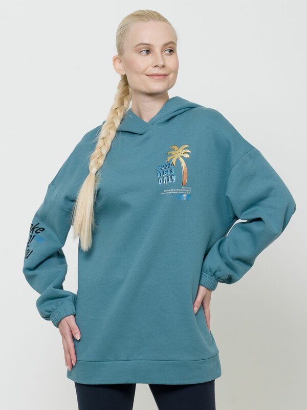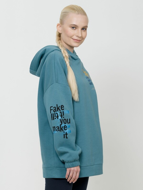 Удлиненное худи свободного силуэта на манжете понизу. НОВЫЙ футер с начесом. Низ рукава оформлен тоннельной резинкой. Принт из разноцветного металлика украшен стразами. Перевод Только хорошие вибрации. Продолжай улыбаться, потому что жизнь прекрасная вещь, и есть еще так много поводов для улыбки. Принт на рукаве с голубым металликом придает изделию большую динамику, разрушая симметрию. Перевод Притворяйся, пока не получится или действуй так, словно ты уже стал тем, кем хочешь.