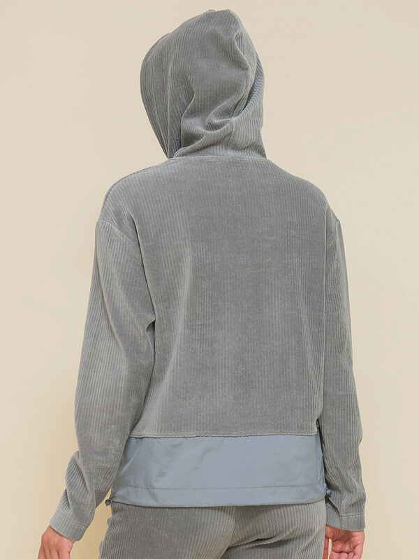 Женская плюшевая толстовка со вставкой из гладкой курточной ткани. Сочетание материалов с разной фактурой — актуальный тренд сезона. Свободная толстовка из трикотажного вельвета со спущенным плечом подарит вам ощущение комфорта и уюта. Худи с капюшоном на кулиске, защитит от холода и ветра. По низу изделия также есть кулиска — её можно затянуть и получится кроп-толстовка. Худи однотонное, без принта. Неприхотливо в уходе. В составе ткани преобладает высококачественый хлопок — толстовка мягкая и прекрасно пропускает воздух. Полиэстер и эластан обеспечивают формоустойчивость надолго. Модель представлена в двух цветах. Чёрная толстовка — практичный, базовый вариант. Серое худи также универсально. Размерный ряд: XS (42); S (44); M (46); L (48); XL (50). Толстовка подходит женщинам, девушкам, девочкам-подросткам. Она идеальная для работы, учёбы, отдыха, перелётов, прогулок. А также может быть использована в качестве домашней одежды. Худи можно носить осенью и весной (демисезон), зимой и в прохладную погоду летом. Такую толстовку легко комбинировать с разными моделями брюк. Она станет замечательным подарком сестре, подруге или маме на Новый год или любой другой праздник.