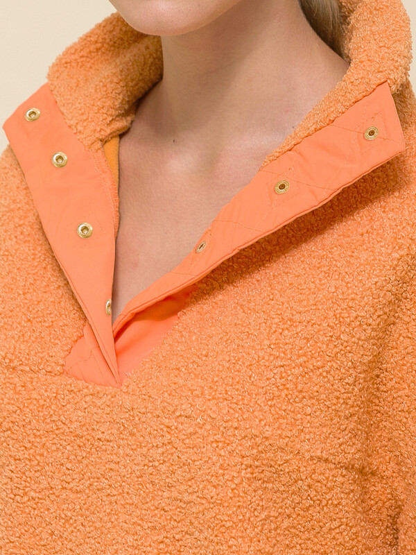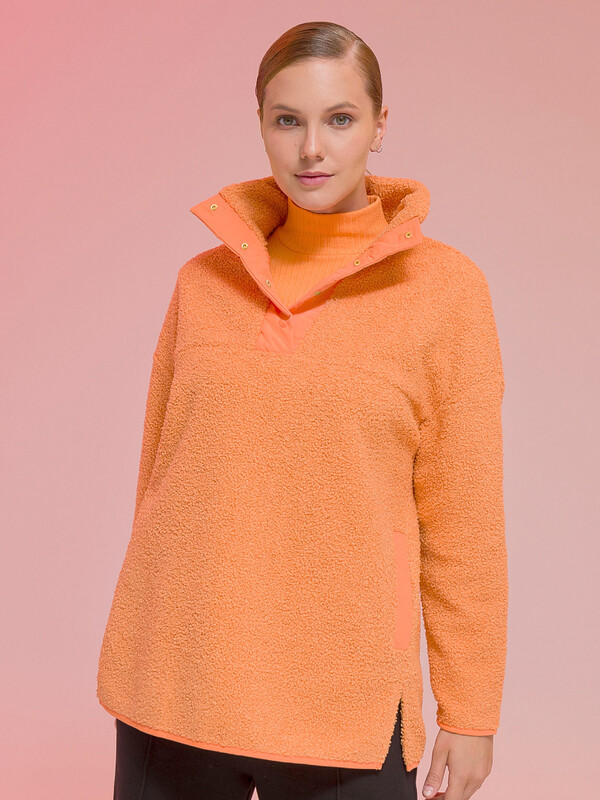 Женская толстовка-анорак из модного бербер-флиса (фактура «барашка»). Куртка свободного силуэта со спущенным плечом застёгивается на кнопки — легко застёгивать и расстёгивать. Декоративная отделка из гладкого «курточного» материала — один из актуальных трендов. В боковых швах удобные карманы. Толстовка без капюшона. Объёмный воротник можно носить двумя способами. Как воротник-стойку — защитит от холода и ветра. И как отложной воротник в более тёплую погоду. Пушистая толстовка лаконичного дизайна, без принта. Она проста в уходе: изделия из флиса прочные, легко стираются, не линяют, быстро сохнут и устойчивы к образованию катышков. Анорак из качественного флиса очень лёгкий, тёплый и прекрасно пропускает воздух. Куртка представлена в двух уютных цветах: оранжевом и молочном. Размерная линейка: XS (42); S (44); M (46); L (48); XL (50). Плюшевая толстовка подходит женщинам, девушкам, девочкам-подросткам. Идеальна как для высоких женщин, так и для девушек среднего роста. Анорак можно носить как куртку ранней осенью или поздней весной. Толстовка с воротником тёплая и мягкая. Объём позволяет надеть под низ футболку или водолазку. Флисовая толстовка — отличный выбор для прогулок и активного отдыха. Для круглогодичного применения: прохладным летом, осенью, зимой, весной и демисезон. Она станет стильным и практичным подарком подруге, дочери или сестре на Новый год или любой другой праздник.