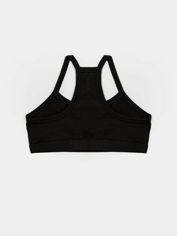 Бюстье из трикотажной кулирки. Горловина округлой формы. Спинка фигурная, как в спортивном топе. Все срезы окантованы бейкой из основного полотна. По нижнему срезу настрочена жаккардовая эластичная тесьма.