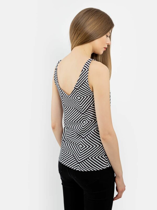 Топ изготовлен из текстильного полотна «сатин». Топ прямого силуэта. Перед и спинка цельнокроенные. По переду из боковых швов по направлению к центру груди застрочены вытачки. Горловина переда и спинки V-образной формы. Горловина переда, спинки и проймы обработаны обтачкой. Обтачка длиной немного выше линии талии. По переду из боковых швов по направлению к центру груди застрочены вытачки.