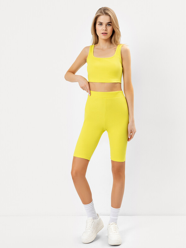 Укороченный облегающий топ на широких бретелях. Выполнен из трикотажной рибаны – в тонкий рубчи. Вырез формы «каре». Рекомендуем!