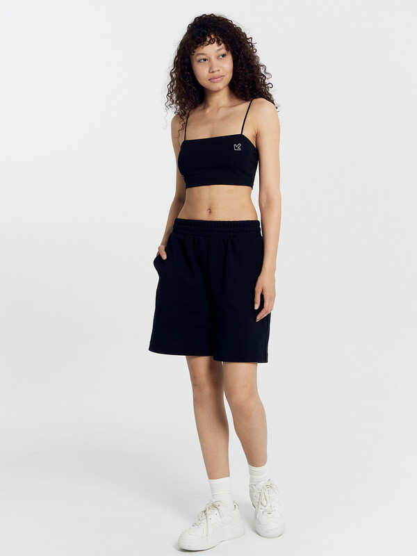 Топ бандо из трикотажного полотна кулирного переплетения. Топ укороченный. Деталь переда двойная, внутренняя деталь из основного полотна. Бретель.