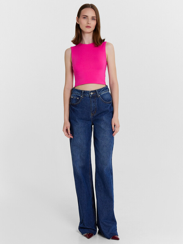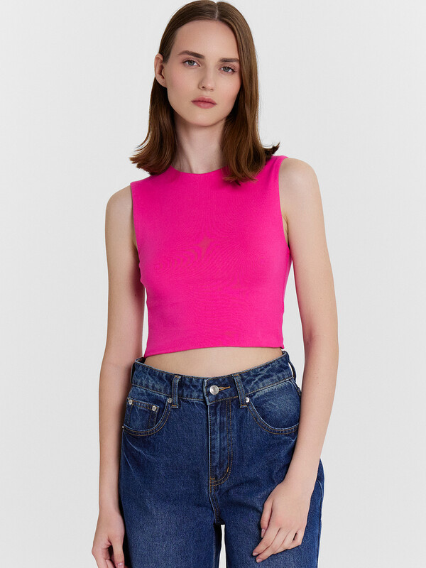 Топ женский прилегающего силуэта из трикотажного полотна рибана. Горловина круглой формы.