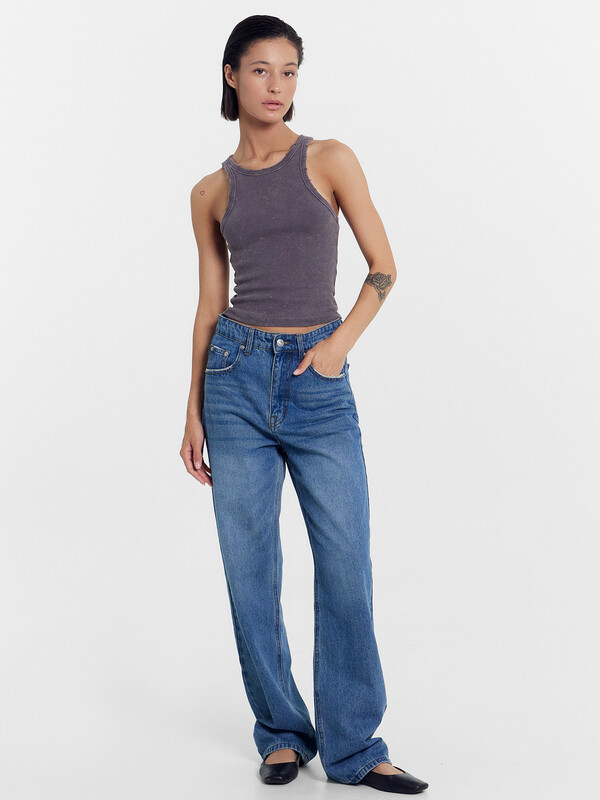 Нижний срез топа обработан швом вподгибку на 2х иглольной плоскошовной машине.