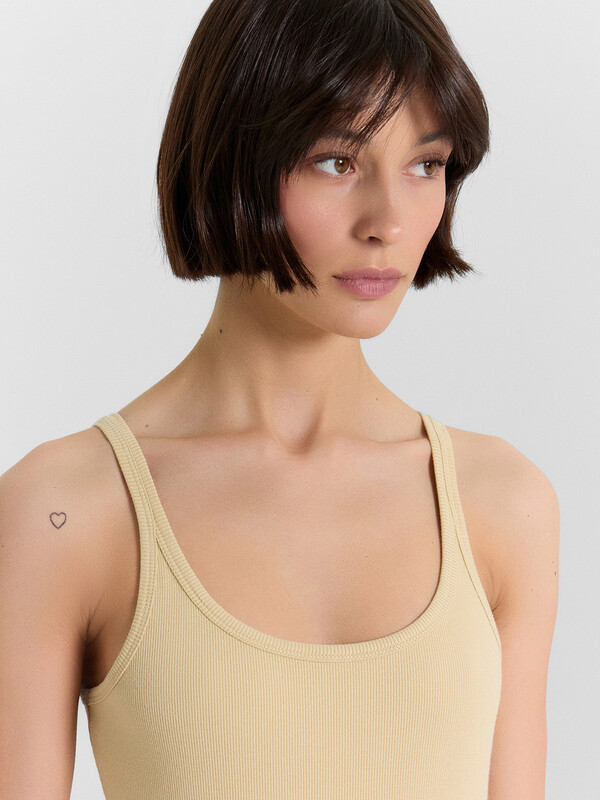 Женский топ прилегающего силуэта — стильный и комфортный элемент гардероба, который подчеркивает женственность и элегантность. Модель выполнена из трикотажной рибаны — мягкого и эластичного материала, который обеспечивает удобную посадку, адаптируясь к движениям тела. Округлая горловина придает классический акцент, а тонкие бретели создают легкий и изящный образ, красиво акцентируя линию плеч и декольте. Срезы горловины и проймы окантованы бейками из основного полотна, что обеспечивает аккуратный вид и дополнительную прочность. Топ отлично сочетается с разными элементами одежды, позволяя создавать стильные образы — от повседневных до более элегантных и вечерних. Идеальный выбор для тех, кто ценит комфорт, женственность и утонченный стиль!