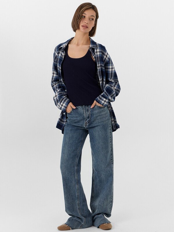 Горловина округлой формы, бретели тонкие. Срезы горловины и проймы окантованы бейками из основного полотна.