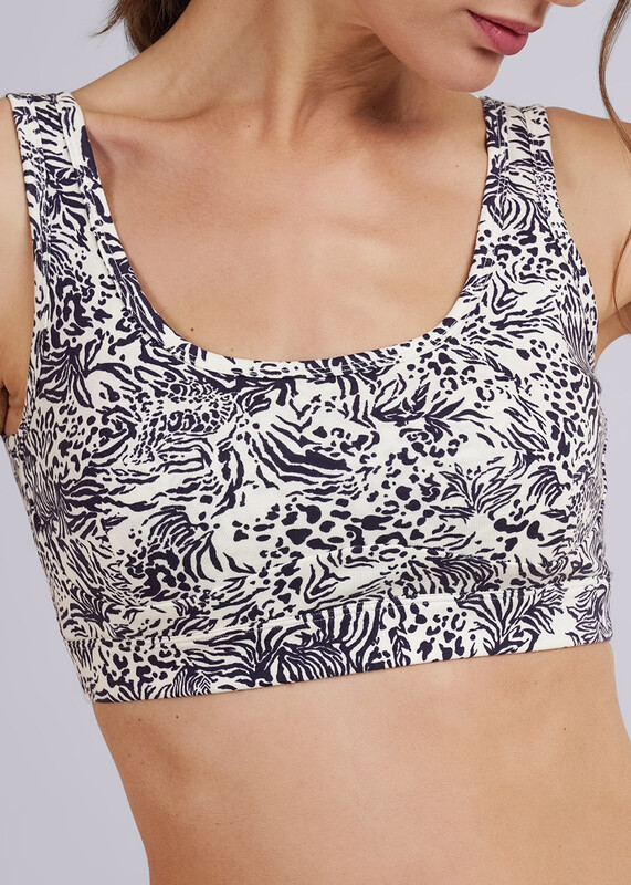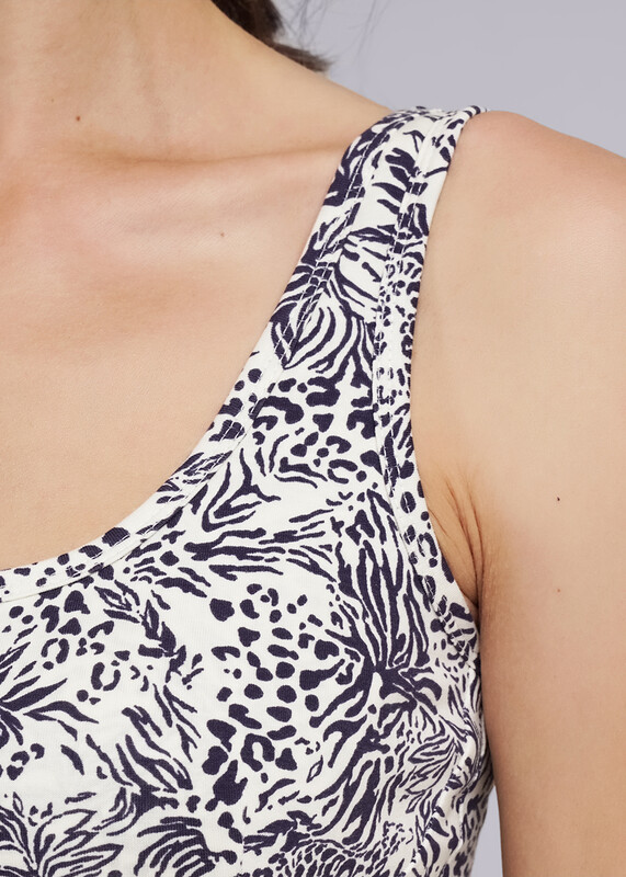 Майка-борцовка из хлопкового трикотажного полотна с эластаном, широкая бретель. Лиф переда двойной. Бретель, горловина и проймы обработаны окантовкой. По низу изделия отрезной пояс с внутренней резинкой. На поясе по центру принт.