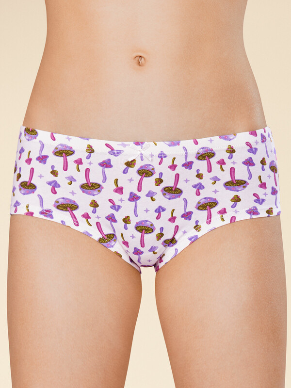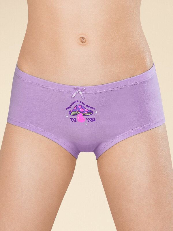 Комплект трусов для девочки из 2-х шт. Шорты выполнены из ткани с высоким содержанием хлопка, что делает их мягкими, гипоаллергенными и дышащими. Благодаря эластану шорты трусы в течение длительного времени сохраняют первозданную форму. Качественный материал и грамотный крой обеспечивают идеальную посадку белья на теле. Мягкая резинка исключает раздражение и трение. В комплект входят трусы детские для девочки двух трендовых оттенков. Нежные и по-настоящему красивые, эти цвета обязательно придутся по душе любой девочке. Трусики для девочки украшены принтом: сиреневые — в виде грибочка с надписью (перевод «хорошие вещи произойдут с тобой»), молочные — сплошным принтом в виде грибочков. Принты эластичные и стойкие, отлично переносят частые стирки. Хлопковые трусы подходят девочкам младшего школьного возраста и девочкам-подросткам. Помните о правильном уходе за изделием: рекомендуется стирать при температуре не выше 30 °C, без предварительного замачивания, с изнанки. Это поможет сохранить качество и цвет белья на длительное время.
