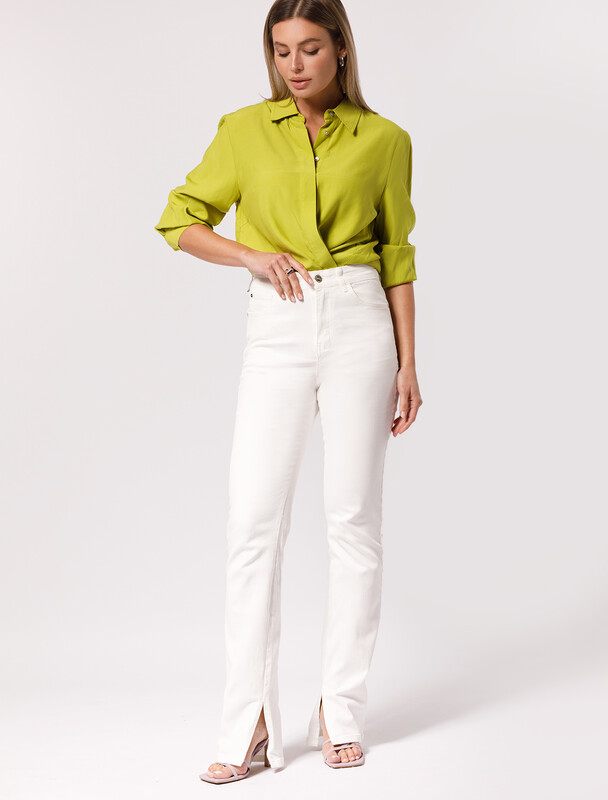 Удлиненные прямые джинсы выполнены из гладкого эластичного хлопка. Высокая посадка грамотно подчеркивает силуэт. Разрезы по бокам добавляют модели изюминку и помогут составить трендовый образ вместе с рубашкой over-size, укороченной футболкой и жакетом.
