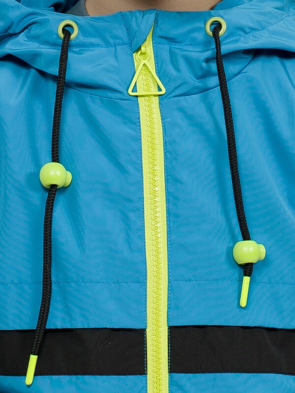 Цельнокроеный 2 шовный капюшон с улучшенной посадкой по форме головы. Регулировка объема капюшона шнуром, конец которого запаян в металлический наконечник, и пластиковым стоппером. Внутренний воротник из основной ткани. По переду и по спинке отрезные кокетки, имитирующие многослойность. Из-под кокетки выглядывает контрастная полоска ткани, придающая спортивность модели. Рукав объемный в верхней части, книзу заужен. Внутри рукава манжета из основной ткани с эластичной резиной внутри.