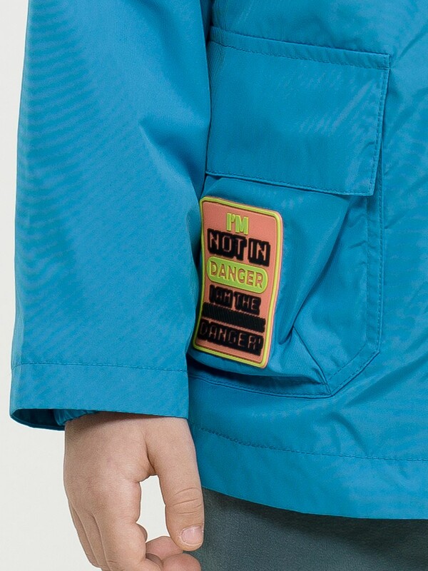 Карманы накладные, объемные, с вытачками понизу, прикрываются клапанами без застежки. На кармане крупная силиконовая нашивка с шрифтовой композицией. Перевод Я не в опасности, я сам опасность. По низу изделия внутренняя регулировка объема эластиком с пластиковым стоппером. В шве кокетки и в боковых швах световозвращающая тесьма.