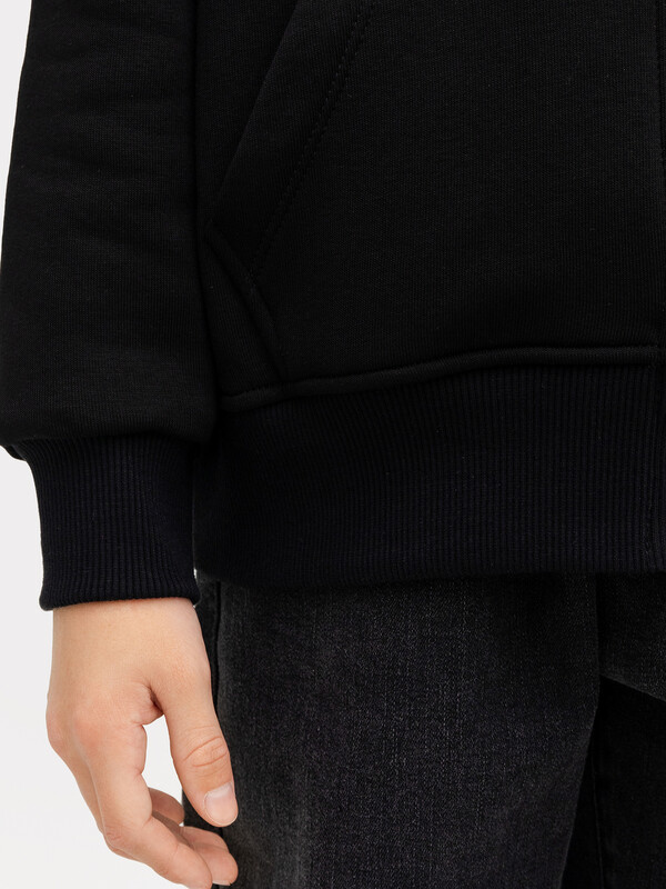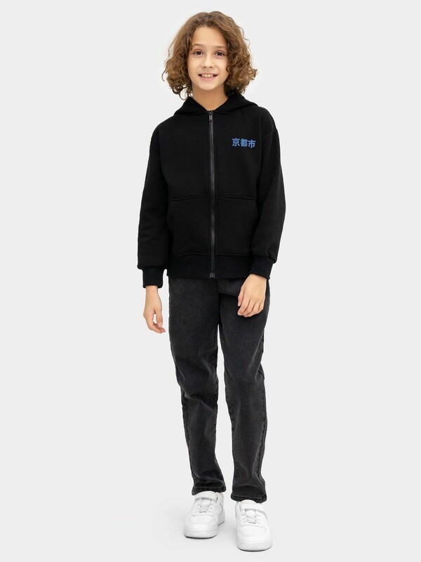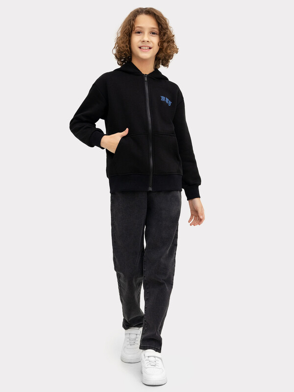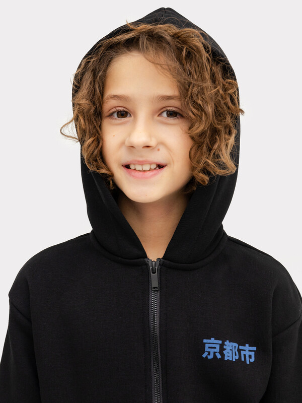Жакет для мальчиков прямого силуэта с капюшоном. Капюшон на подкладке из основного полотна. Шов втачивания капюшона закрыт х/б тесьмой. Рукава втачные, линия плеча спущена. Притачные манжеты по низу рукавов и притачной пояс из рибаны. По переду застежка молния, карман кенгуру.