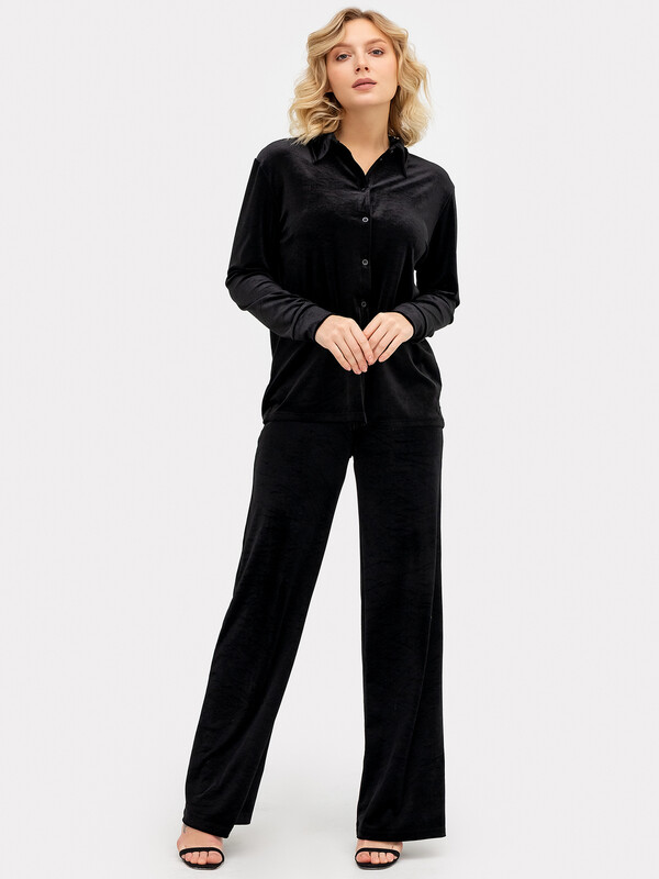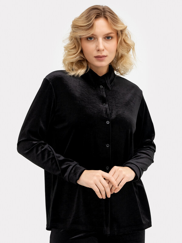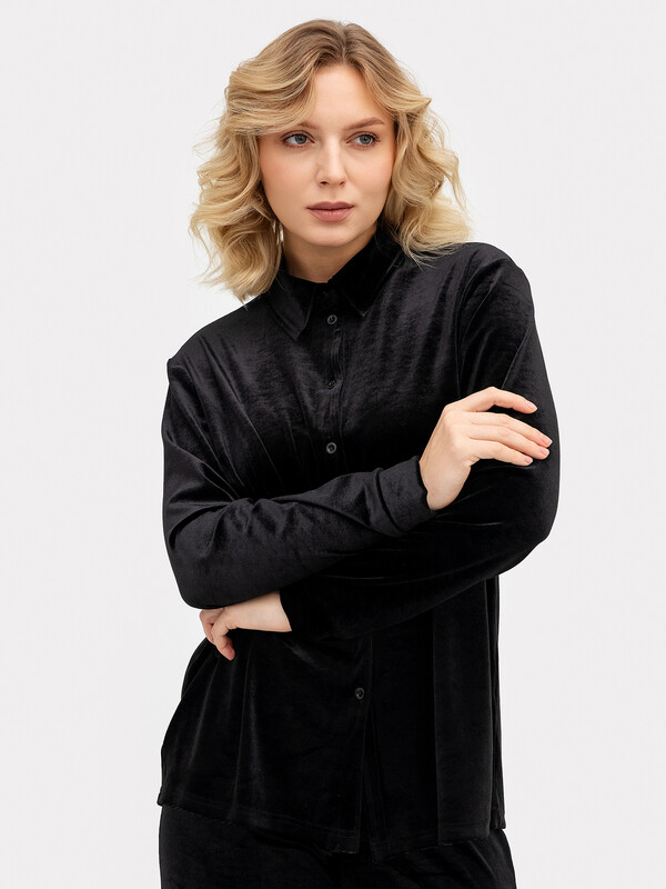 Красивая велюровая рубашка свободного силуэта. Вырез круглый, с отложным воротничком. По центру рубашка застегивается на пуговицы. Спущенная линия плеча и углубленная пройма дарит особый комфорт и свободу. Рукава длинные, на манжетах. Нижняя часть рубашка асимметрична. Красиво!