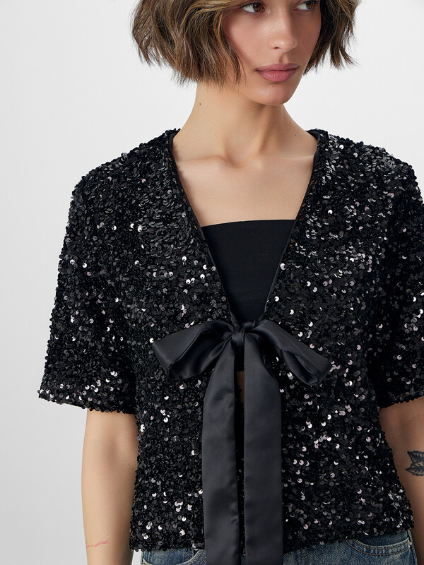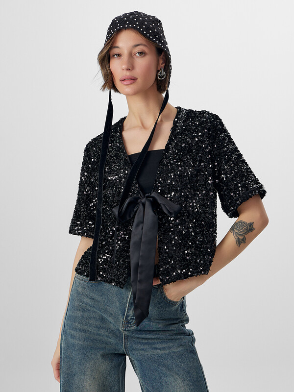 Жакет женский, выполнены из трикотажного полотна велюр с пайетками. Жакет прямой, свободный, укороченный. Горловина V-образной формы. Рукава втачные, длиной до локтя. Жакет на подкладке из сатина. По переду завязки из репсовой ленты на бант.