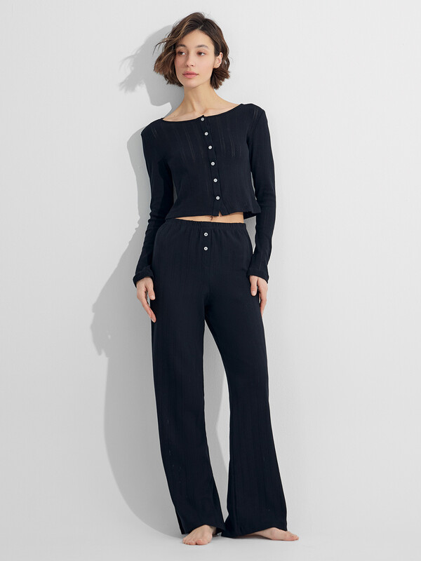 Укороченный домашний жакет — это уютная и женственная вещь для расслабленных дней. Он выполнен из мягкой хлопковой рибаны, которая обеспечивает комфорт, хорошо тянется и приятно облегает фигуру.