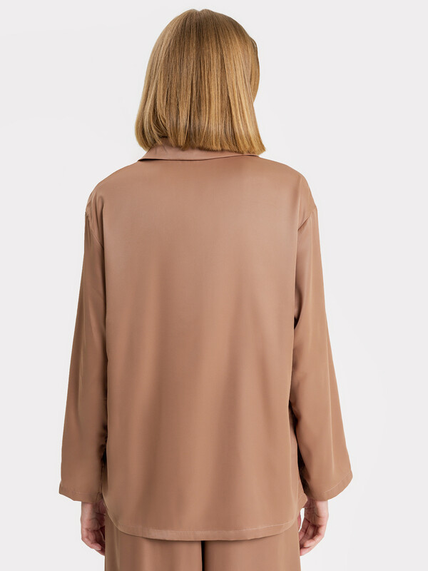 Силуэт прямой и свободный, рукава длинные втачные, линия плеча немного спущена. Центральная застежка на пуговицы, воротник отложной. Низ изделия и низ рукавов застрочен швом в подгибку.