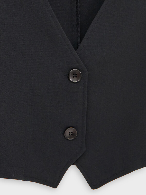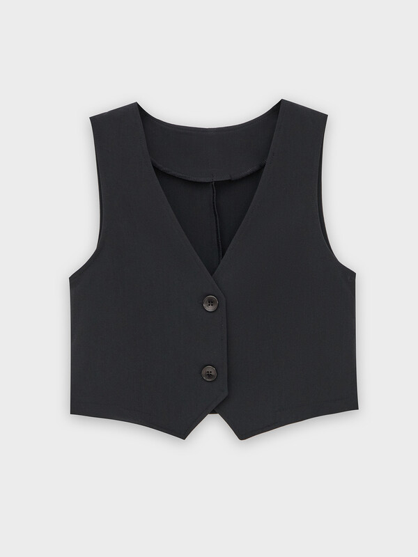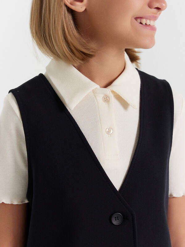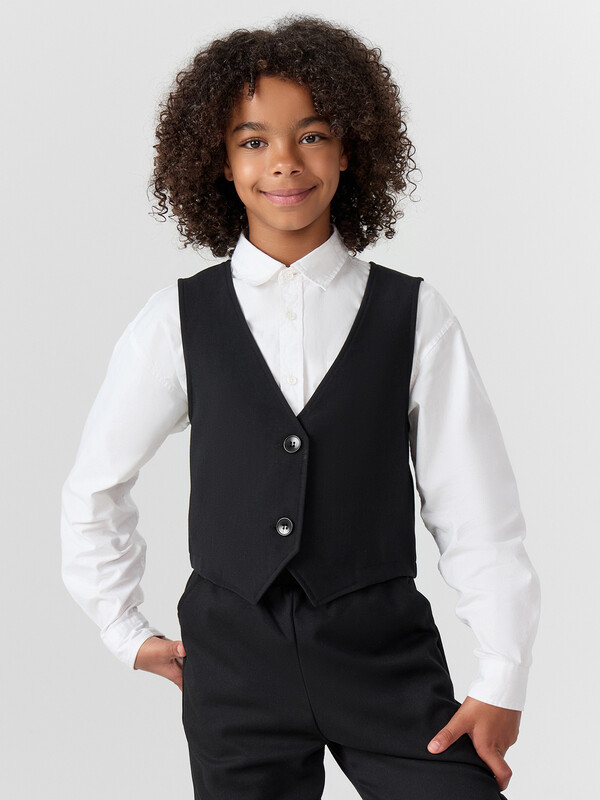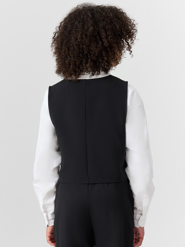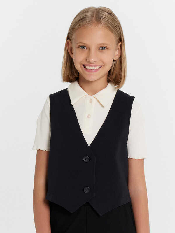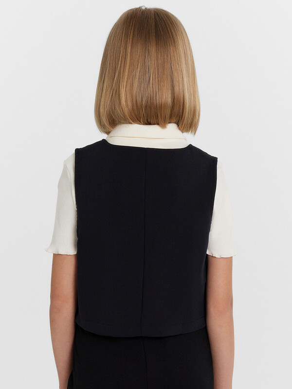 Жилет для девочек прямого силуэта, укороченный. Треугольный вырез горловины. Без подкладки. Застежка на 2 пуговицы. Низ жилета обработан швом в подгибку.