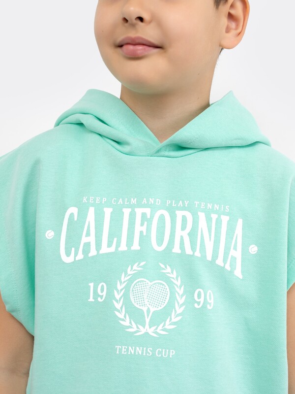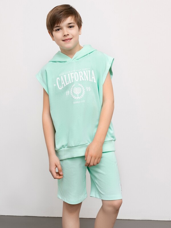 Стильная жилетка из легкого трикотажного футера. Силуэт модели свободный. Есть просторный уютный капюшон на подкладке. По нижнему краю проходит пояс из рибаны. Стильный жилет для вашего мальчика!