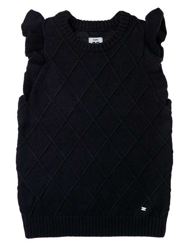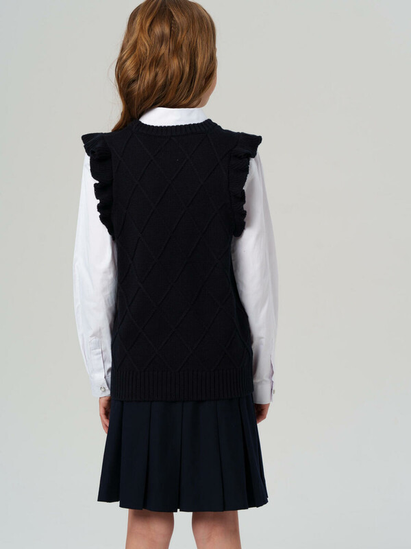 Классический темно-синий школьный вязаный жилет для девочки подростка от PlayToday — элегантный и удобный элемент школьного гардероба. Фактурная вязка и декоративные рукава-крылышки добавляют образу изысканности, оставаясь в рамках строгого стиля.